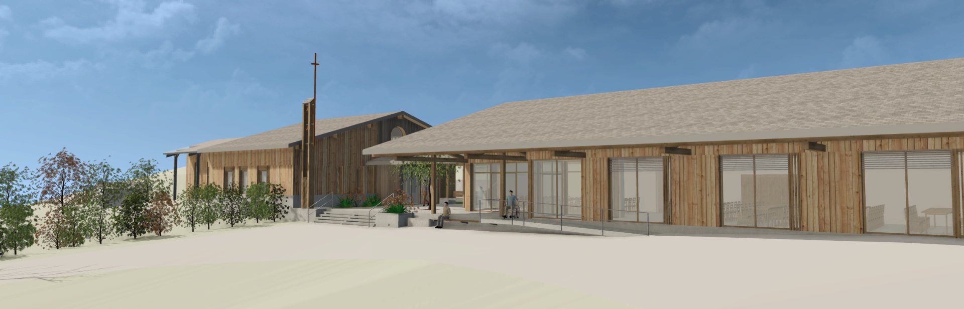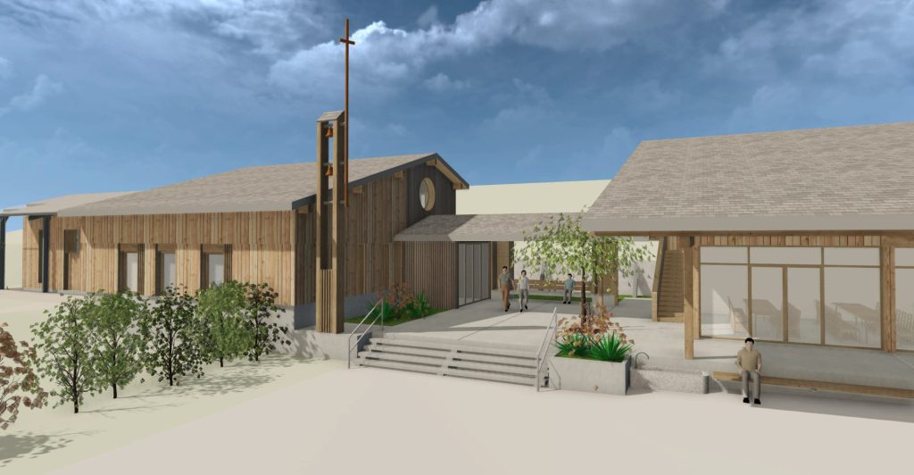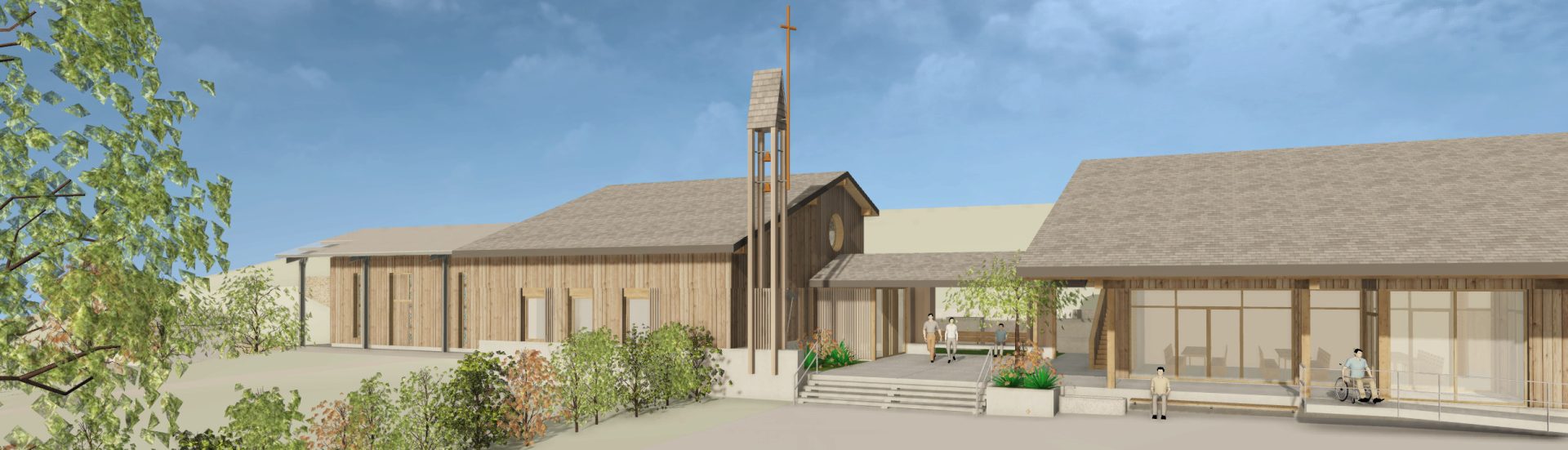 Il nous est apparu nécessaire de construire des lieux plus adéquats pour répondre à cette affluence. Il y a à l’arrière du site, une ferme industrielle dont certains hangars sont trop vétustes pour être utilisés. Nous allons les démolir et aménager en leur place une chapelle, des salles d’accueil et une cuisine professionnelle pour la transformation de nos récoltes. Le projet va ainsi s’insérer en retrait sur le site, dans la continuité des bâtiments agricoles restants.