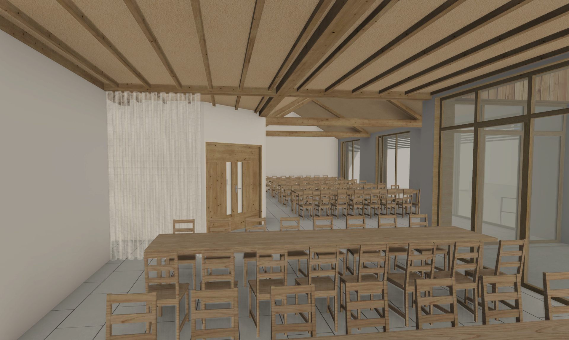 Pour répondre à la diversité des besoins, les lieux seront modulables. Les jours d’affluence, les grandes portes de la chapelle s’ouvriront entièrement, prolongeant le lieu de prière jusqu’au fond du narthex. De leur côté, les deux salles d’accueils seront communicantes afin d’accueillir jusqu’à 140 personnes. Reliées à la cuisine professionnelle, elles serviront à la fois de salles à manger et d’atelier de transformation au moment des récoltes de l’été